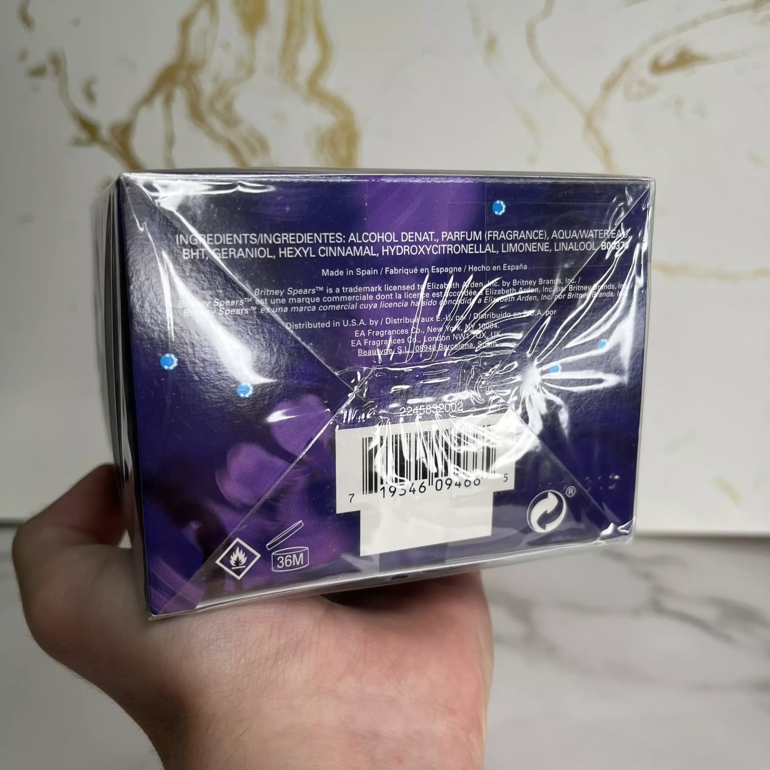 - El frasco de Midnight Fantasy es característico de la línea Fantasy de Britney Spears. Tiene forma de una botella de cristal azul oscuro con detalles en forma de diamante, lo que le da un aspecto lujoso y misterioso. La tapa tiene forma de estrella y está adornada con detalles plateados y rosados, lo que le añade un toque femenino y glamoroso.